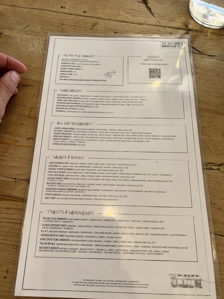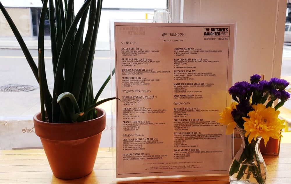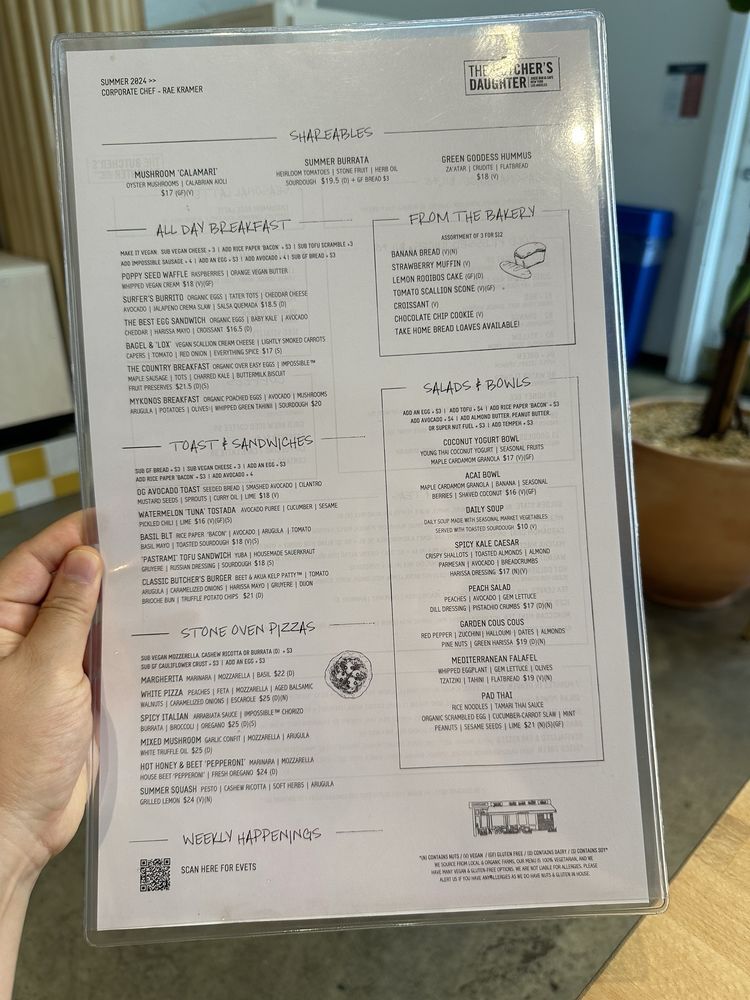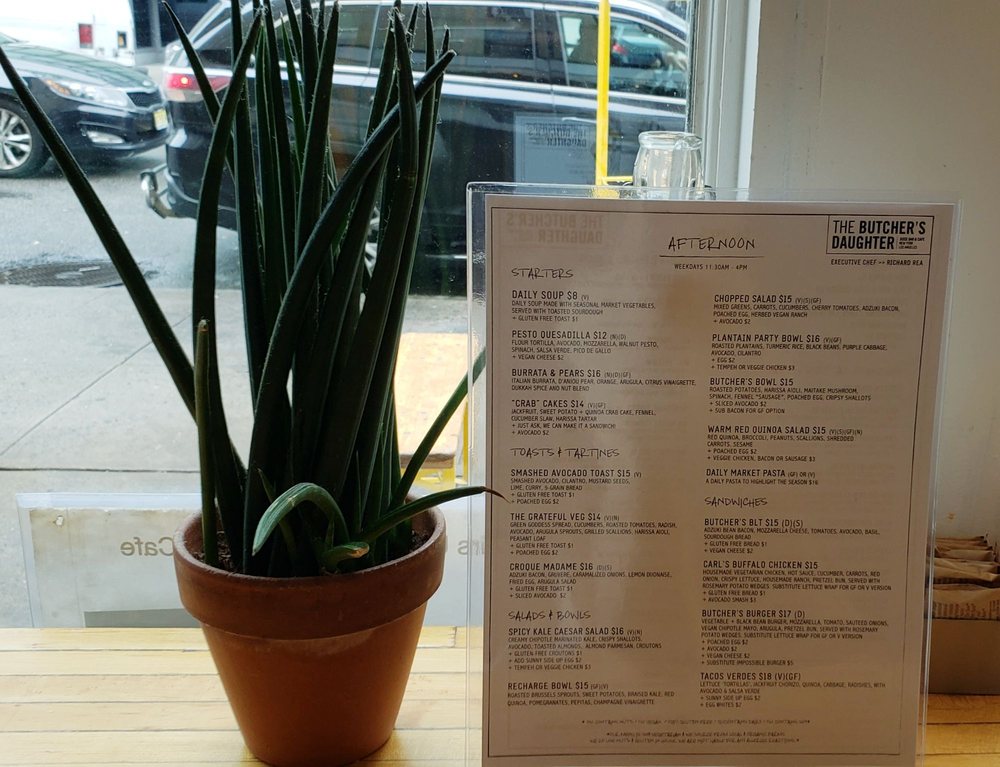 "The Butcher's Daughter" in New York City offers a breakfast and brunch menu featuring vegan options, delivery, and takeout services. With a trendy and hipster vibe, this restaurant also provides a range of amenities like wheelchair accessibility, outdoor seating, and gender-neutral restrooms. The menu includes items like Acai Bowls, Americano Coffee, artisan cookies, and unique dishes like the Brass Monkey and Brazilian Blast. Customers have praised the vegan and vegetarian offerings, with highlights including the Surfer Burrito, Country Breakfast, and cold-pressed juices. The ambiance is described as cozy and welcoming, with options for indoor and outdoor seating. Overall, "The Butcher's Daughter" is a popular spot for delicious vegan and vegetarian brunch options in a vibrant setting.